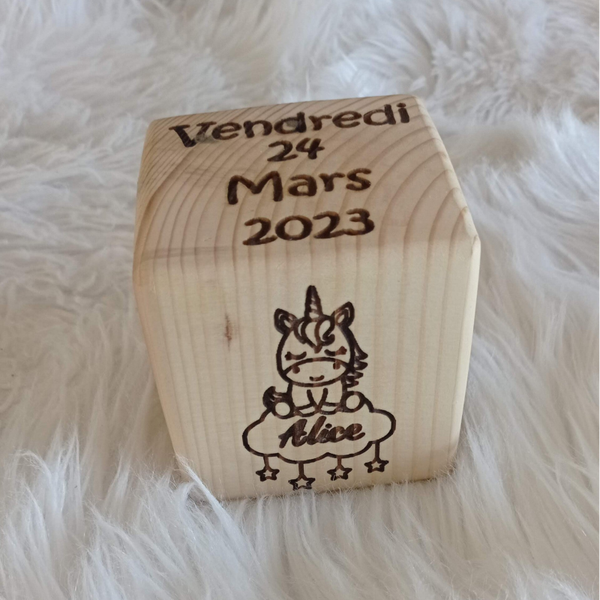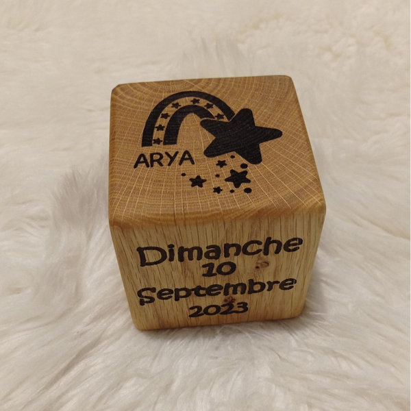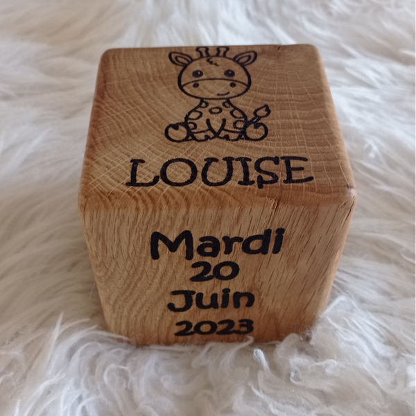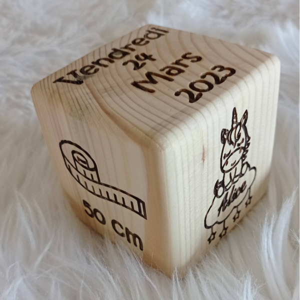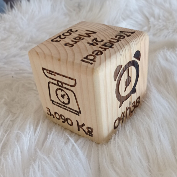 Découvrez notre magnifique Dé de naissance, le complément idéal pour toute chambre d'enfant. Fabriqué en bois de haute qualité, ce dé unique présente tous les détails essentiels de la naissance d'un bébé, comme la date, l'heure, le poids et la taille. Chaque face du dé est finement gravée, créant un souvenir intemporel qui sera chéri pendant des années. Qu'il s'agisse d'un cadeau spécial pour les jeunes parents ou d'un souvenir pour votre enfant, notre Dé de naissance est une façon pleine de sens de commémorer l'arrivée d'un nouveau-né. Fabriqué à la main avec soin et souci du détail, ce dé en bois est un ajout vraiment spécial à notre collection.